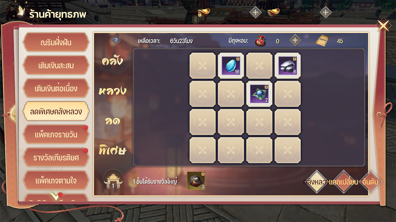 ผู้เล่นสามารถกดรับถุงหอมได้ฟรี 3 ชิ้น หรือซื้อถุงหอมได้จากเมนูแลกเปลี่ยน เพื่อมาเปิดป้ายลุ้นรางวัลเป็นไอเทมสำหรับ พัฒนาตัวละคร / ภูต / คู่หู รวมถึงได้แต้มเพื่อแลกไอเทมเพิ่มเติมในเมนูแลกเปลี่ยน ไฮไลท์ไอเทม "หยกเวิเศษชีพจรฟ้า" และ "คัมภีร์วิทยายุทธล้ำเลิศ"