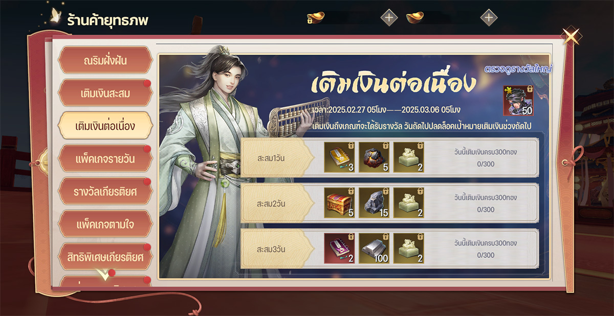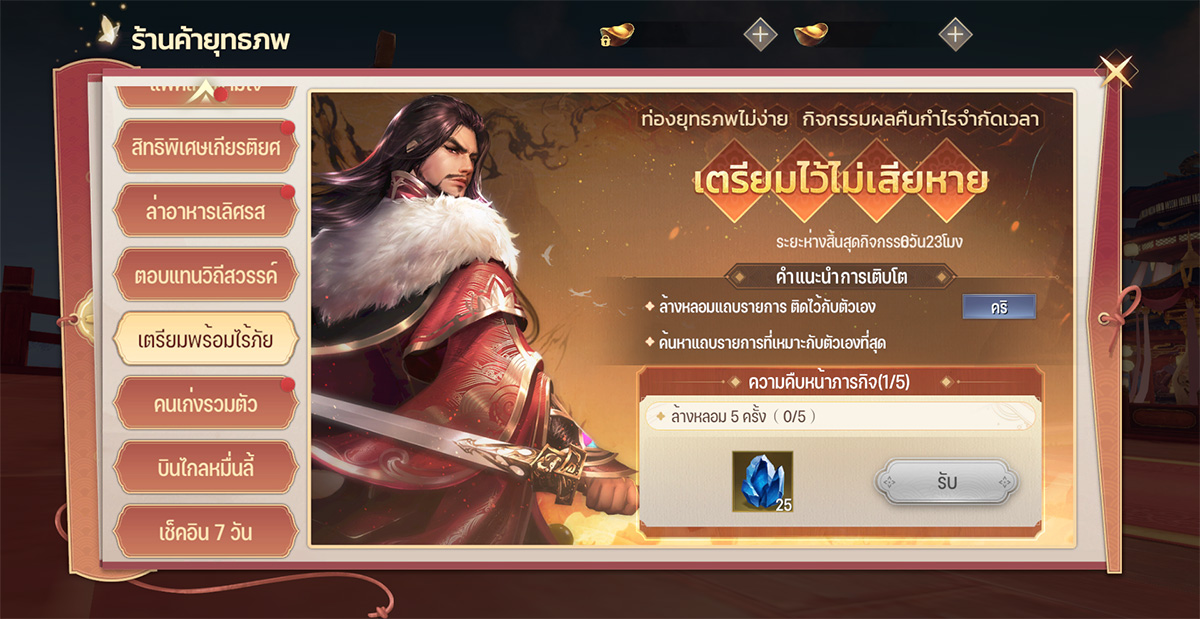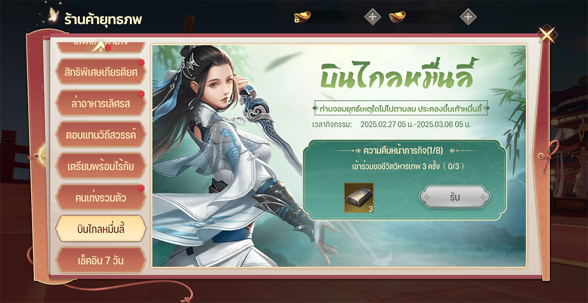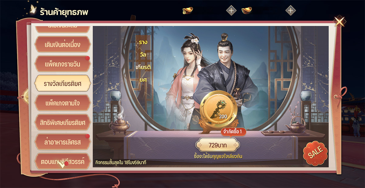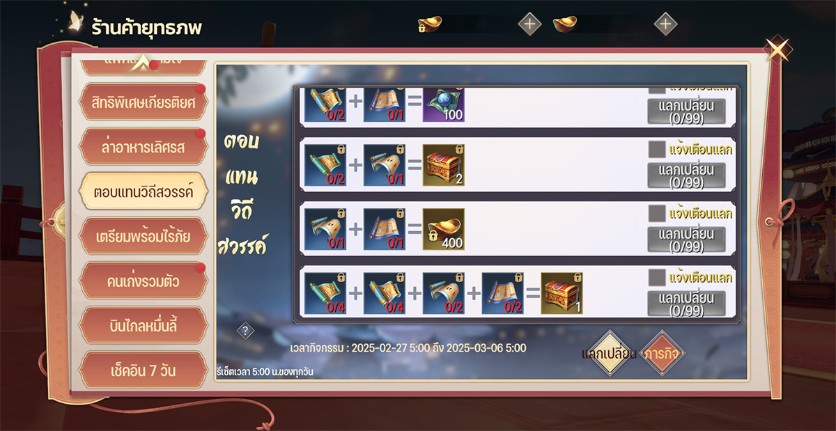 ร้านค้าจำกัดซื้อรายวัน โดยไอเทมจะเปลี่ยนไปทุกวัน ไฮไลท์ไอเทม ตรามังกรวารี / ชิ้นส่วนซื่อกู้เจี้ยน