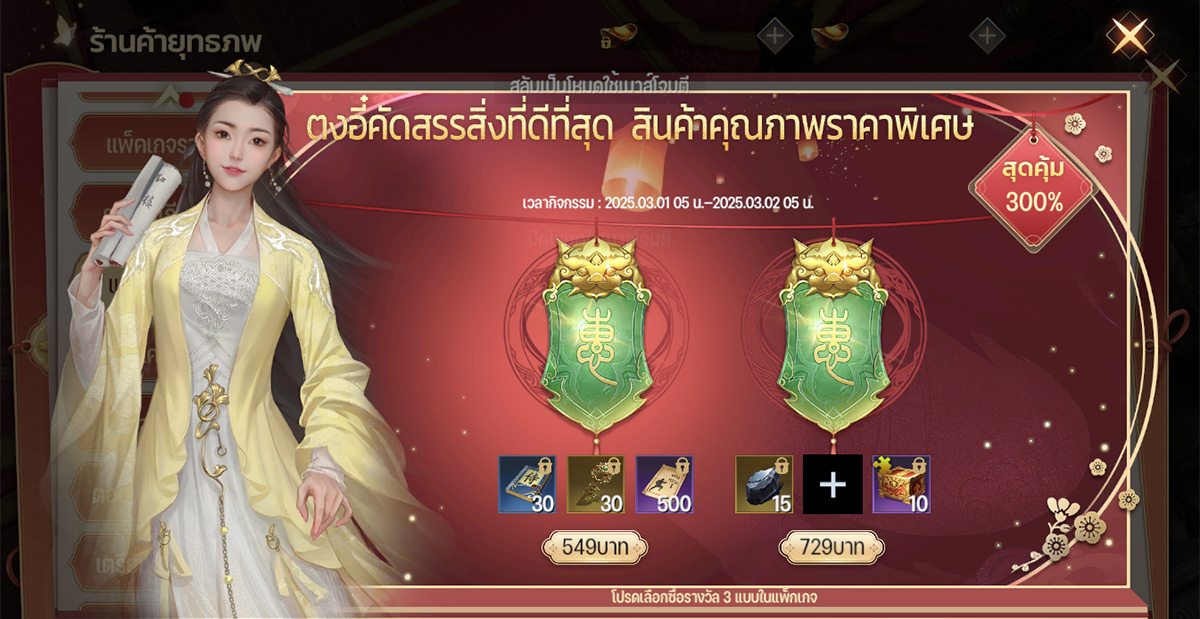 เลือกไอเทมได้ตามใจมีทั้ง แบบราคา 549 บาทและ 729 บาท ไฮไลท์ไอเทม หนังสืองภาพระดับสีฟ้า / วัตถุดิบสร้างอุปกรณ์สภาแดง