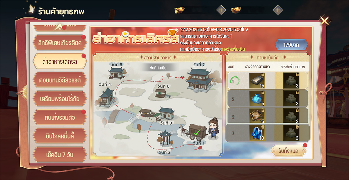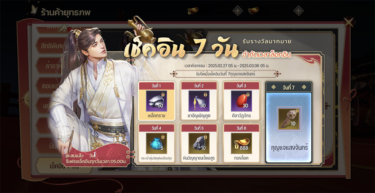 กิจกรรมเช็คอินเข้าเล่นเกมทุกวัน 7 วัน ได้รับไอเทมหลากหลายไม่ซ้ำ และเมื่อซื้อเพิ่ม 179 บาท จะได้รับได้รับไอเทมหลากหลาย ไฮไลท์ไอเทม ตรามังกรวารี