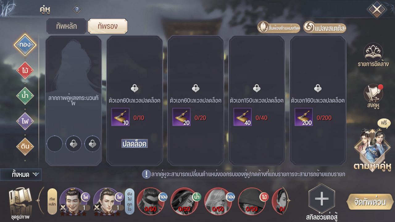 - สเตตัสรวม 3% ของคู่หูที่ลงในตำแหน่งทัพรอง (ทัพทอง, ไม้, น้ำ, ไฟ, ดิน) ตำแหน่งที่ 1 ถึง 4 เรียงจากซ้ายไปขวา จะถูกนำมาแปลงเป็นสเตตัสของตัวละครหลัก