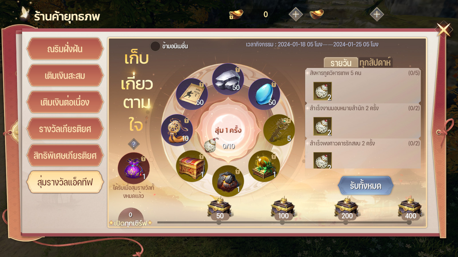 สำเร็จภารกิจจากกิจกรรมสุ่มรางวัลแอ็คทีฟทั้งรายวันและรายสัปดาห์เพื่อสะสมเหรียญแอ็คทีฟ นำไปสุ่มรับไอเทมพัฒนา CP มากมาย
