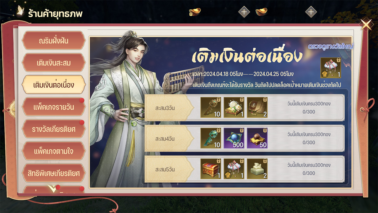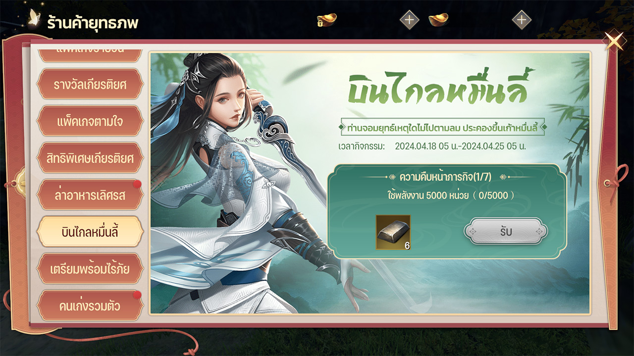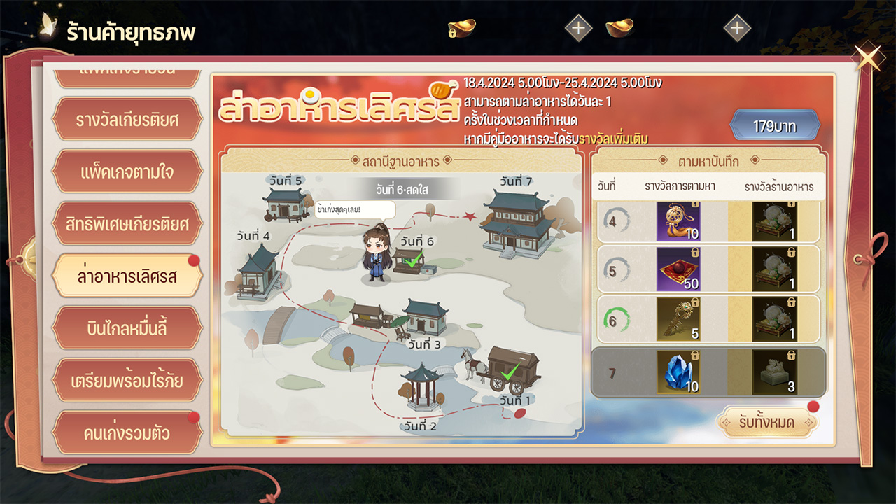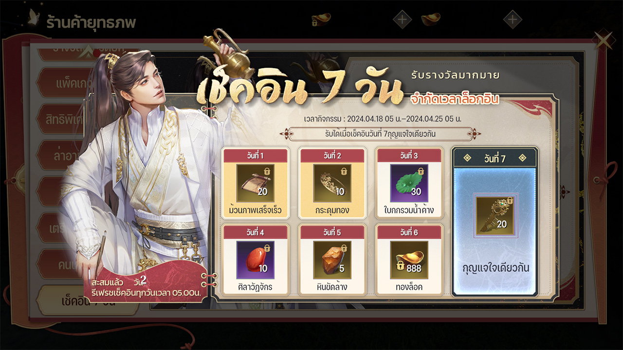 กิจกรรมเช็คอินเข้าเล่นเกมทุกวัน 7 วัน ได้รับไอเทมหลากหลายไม่ซ้ำ และเมื่อซื้อเพิ่ม 179 บาท จะได้รับได้รับไอเทมหลากหลาย ไฮไลท์ไอเทม ชิ้นส่วนคู่หูแดง 3 ตัว แบบเลือกเอง / ตรามังกรวารี / น้ำค้างภูเขาสวรรค์