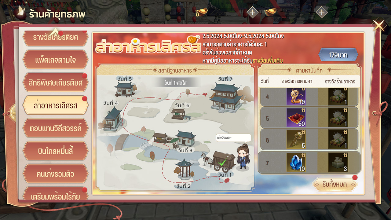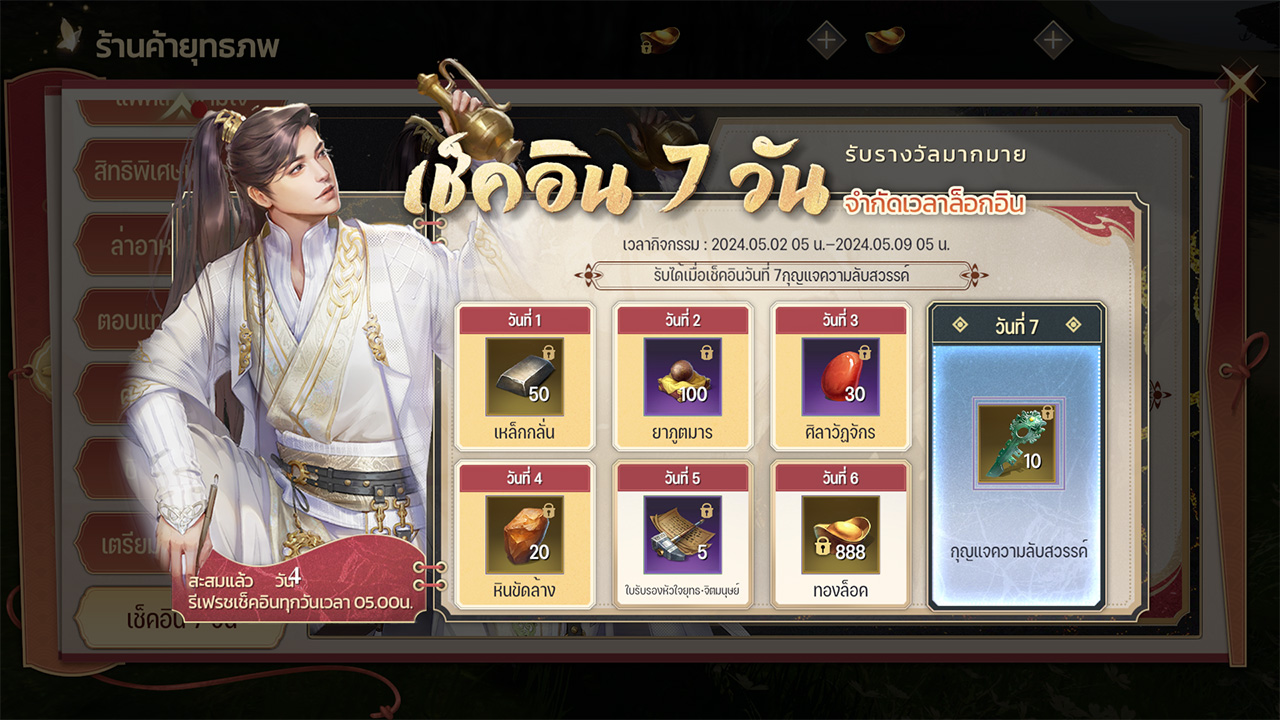 กิจกรรมเช็คอินเข้าเล่นเกมทุกวัน 7 วัน ได้รับไอเทมหลากหลายไม่ซ้ำ และเมื่อซื้อเพิ่ม 179 บาท จะได้รับได้รับไอเทมหลากหลาย ไฮไลท์ไอเทม ชิ้นส่วนคู่หูแดง 3 ตัว แบบเลือกเอง / ตรามังกรวารี / น้ำค้างภูเขาสวรรค์