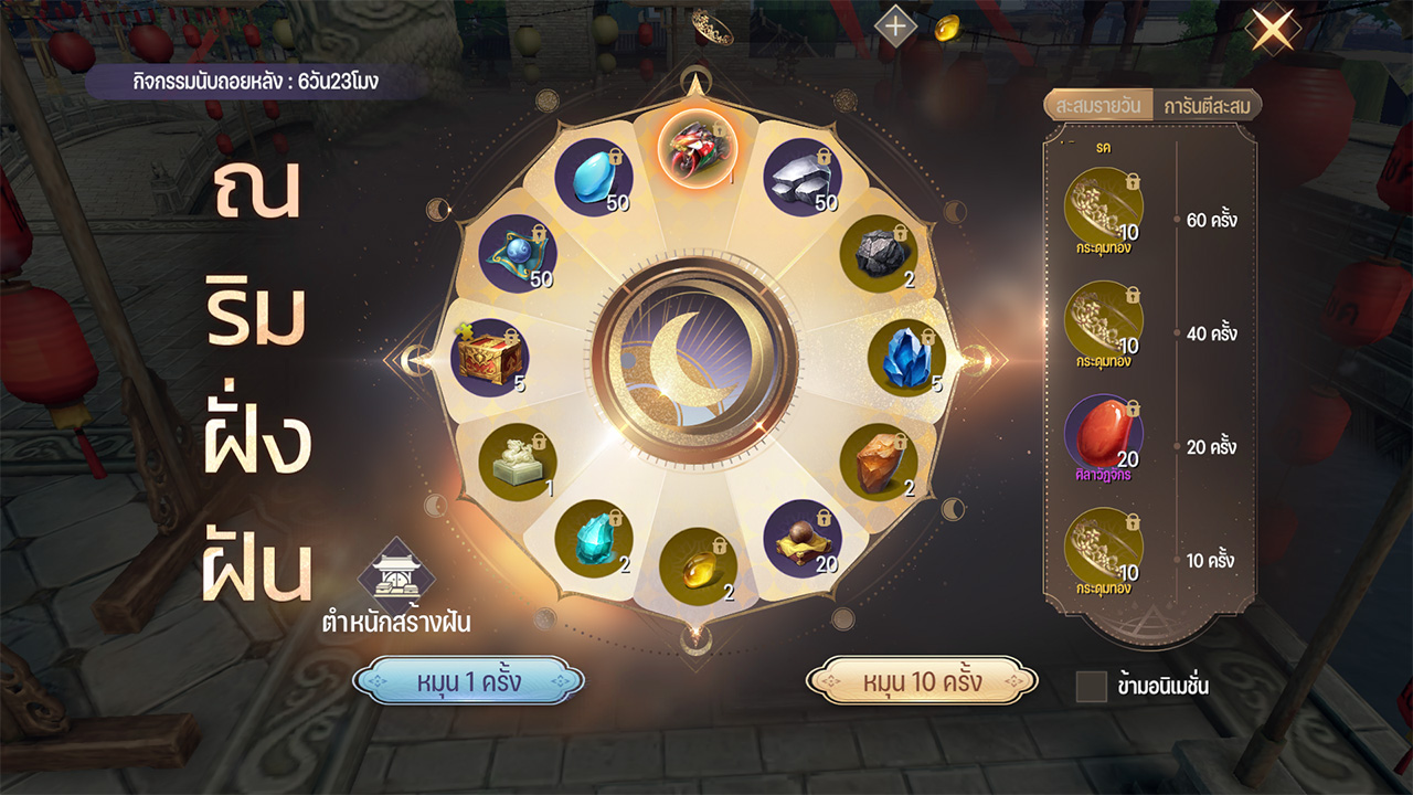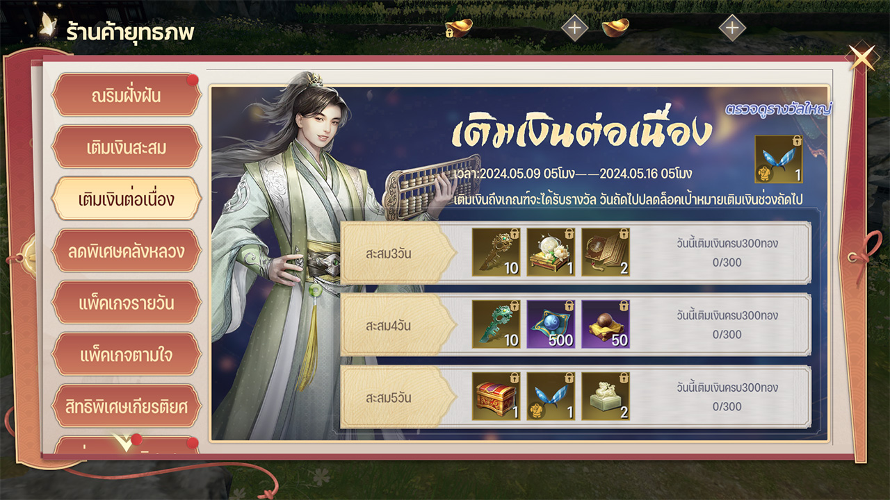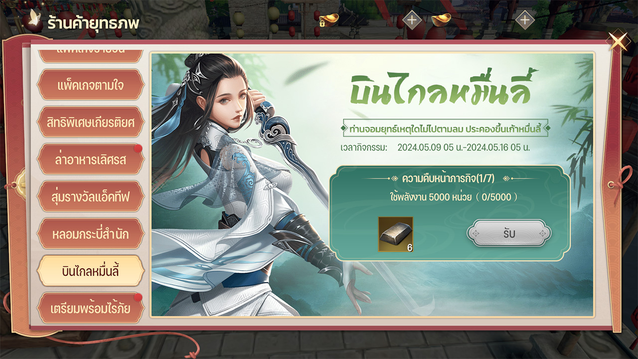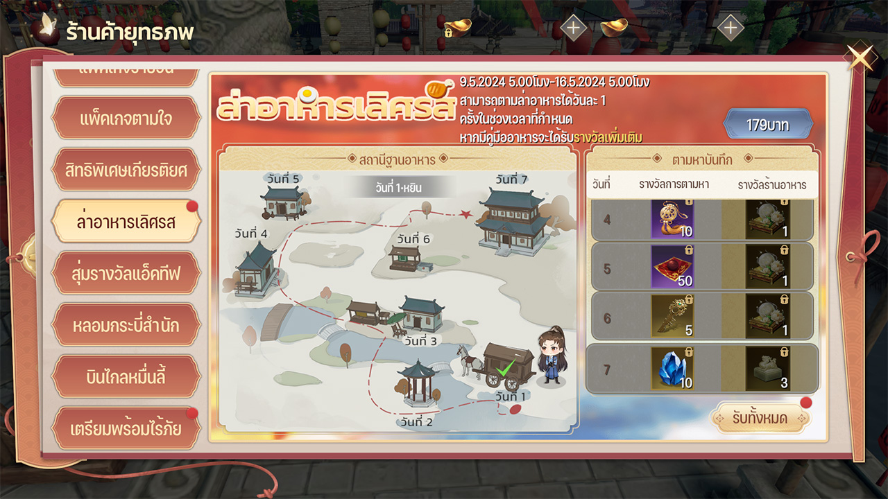 กิจกรรมเช็คอินเข้าเล่นเกมทุกวัน 7 วัน ได้รับไอเทมหลากหลายไม่ซ้ำ และเมื่อซื้อเพิ่ม 179 บาท จะได้รับได้รับไอเทมหลากหลาย ไฮไลท์ไอเทม ชิ้นส่วนคู่หูแดง 3 ตัว แบบเลือกเอง / ตรามังกรวารี / น้ำค้างภูเขาสวรรค์