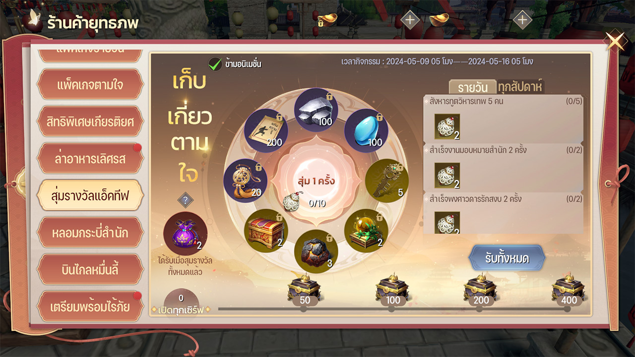 สำเร็จภารกิจจากกิจกรรมสุ่มรางวัลแอ็คทีฟทั้งรายวันและรายสัปดาห์เพื่อสะสมเหรียญแอ็คทีฟ นำไปสุ่มรับไอเทมพัฒนา CP มากมาย ไฮไลท์ไอเทม แพ็ครวมสร้างนภาแดง / หยกวิเศษชีพจรฟ้า