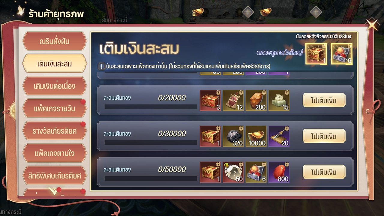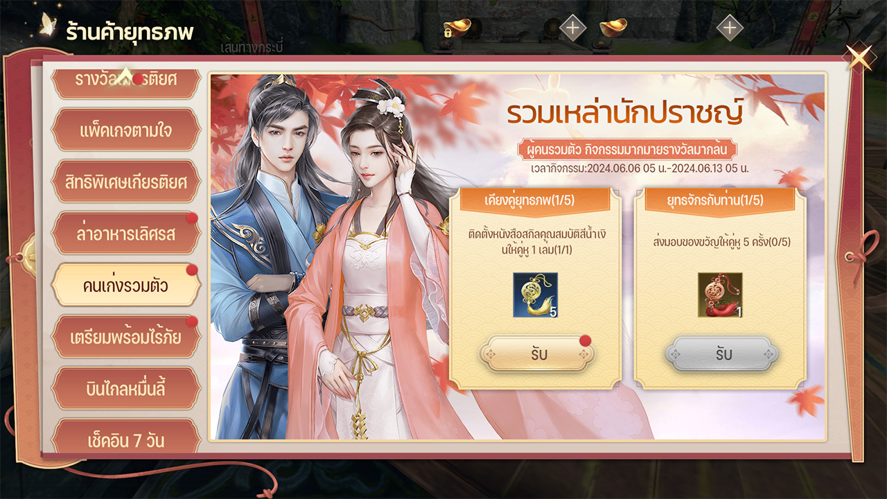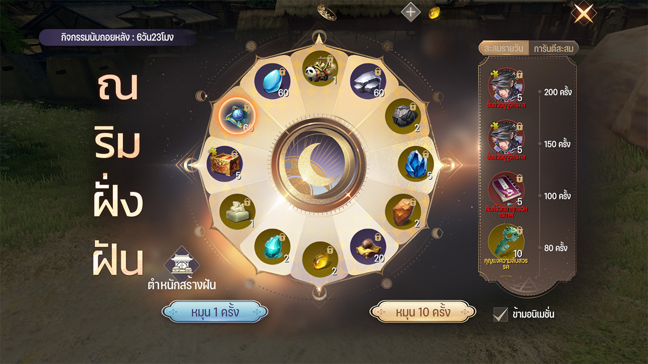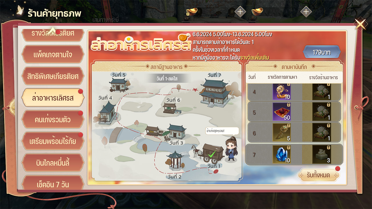 กิจกรรมเช็คอินเข้าเล่นเกมทุกวัน 7 วัน ได้รับไอเทมหลากหลายไม่ซ้ำ และเมื่อซื้อเพิ่ม 179 บาท จะได้รับได้รับไอเทมหลากหลาย ไฮไลท์ไอเทม ชิ้นส่วนคู่หูแดง 3 ตัว แบบเลือกเอง / ตรามังกรวารี / น้ำค้างภูเขาสวรรค์
