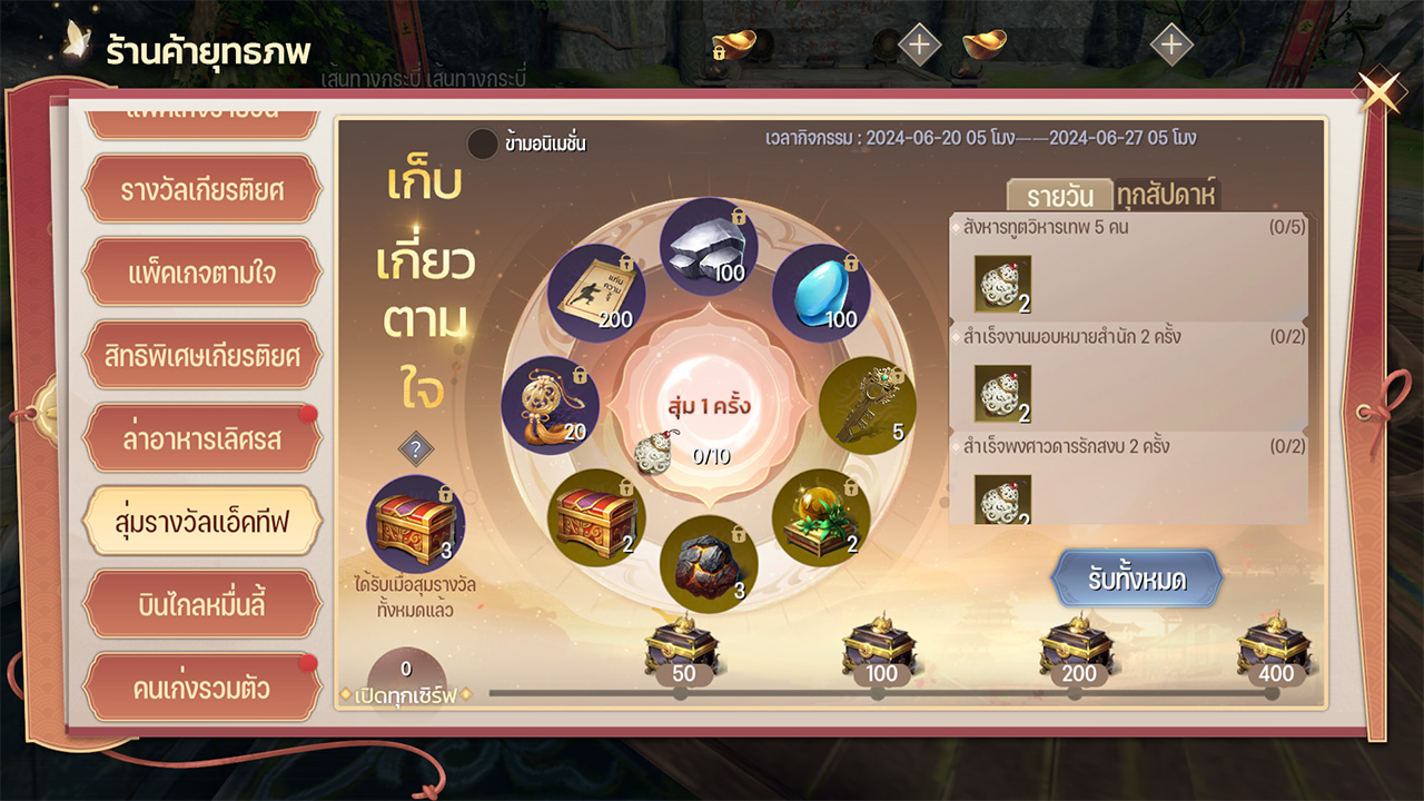 สำเร็จภารกิจจากกิจกรรมสุ่มรางวัลแอ็คทีฟทั้งรายวันและรายสัปดาห์เพื่อสะสมเหรียญแอ็คทีฟ นำไปสุ่มรับไอเทมพัฒนา CP มากมาย ไฮไลท์ไอเทม กล่องสมบัติหินแห่งโชคชะตา - จิตมนุษย์ / หยกวิเศษชีพจรฟ้า