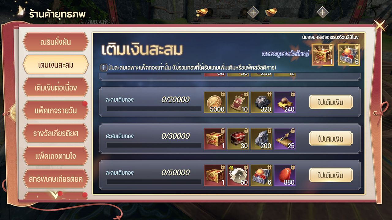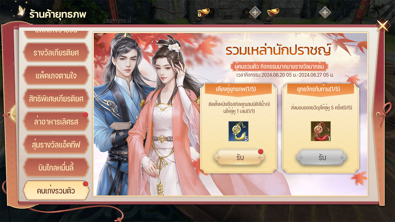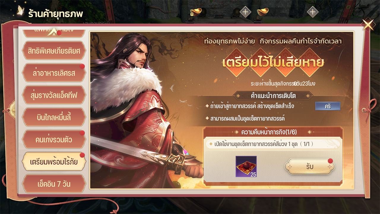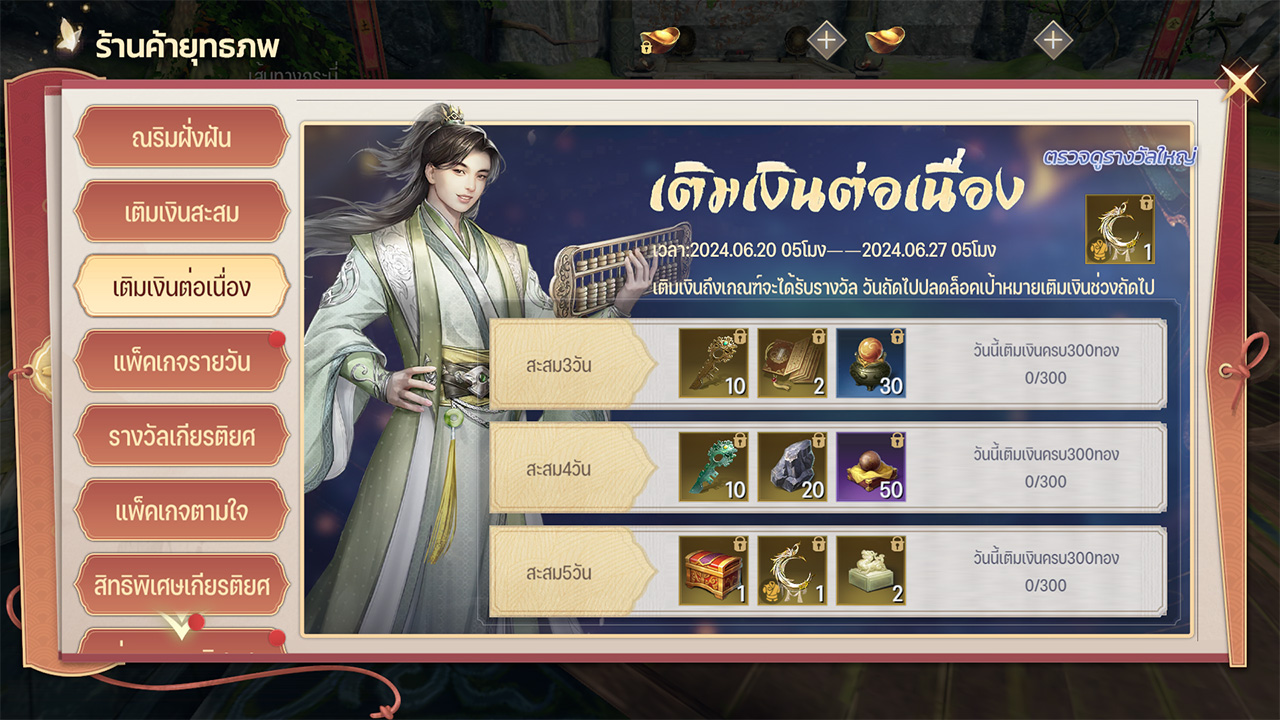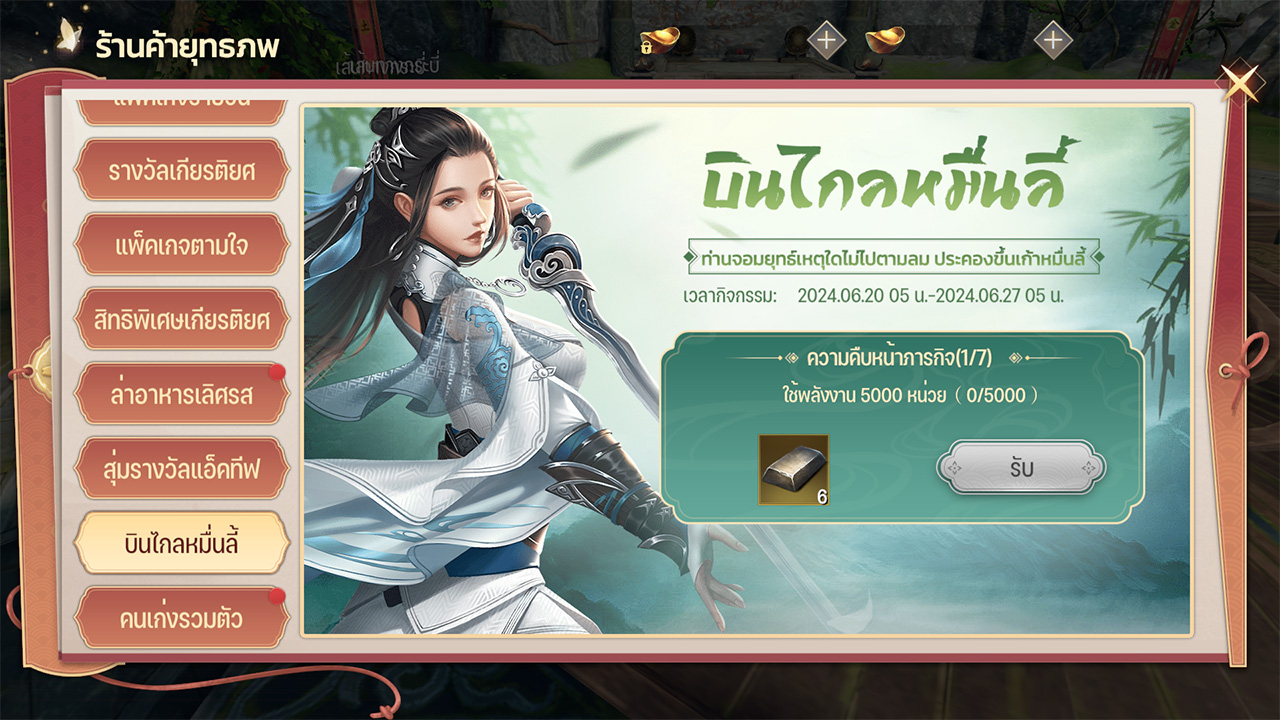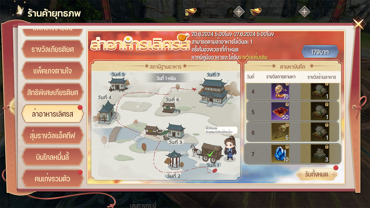 กิจกรรมเช็คอินเข้าเล่นเกมทุกวัน 7 วัน ได้รับไอเทมหลากหลายไม่ซ้ำ และเมื่อซื้อเพิ่ม 179 บาท จะได้รับได้รับไอเทมหลากหลาย ไฮไลท์ไอเทม ชิ้นส่วนคู่หูแดง 3 ตัว แบบเลือกเอง / ตรามังกรวารี / น้ำค้างภูเขาสวรรค์