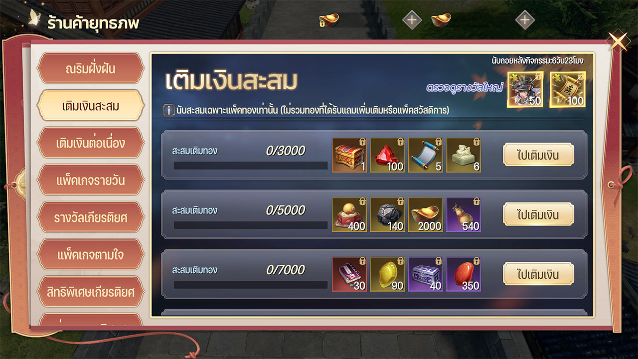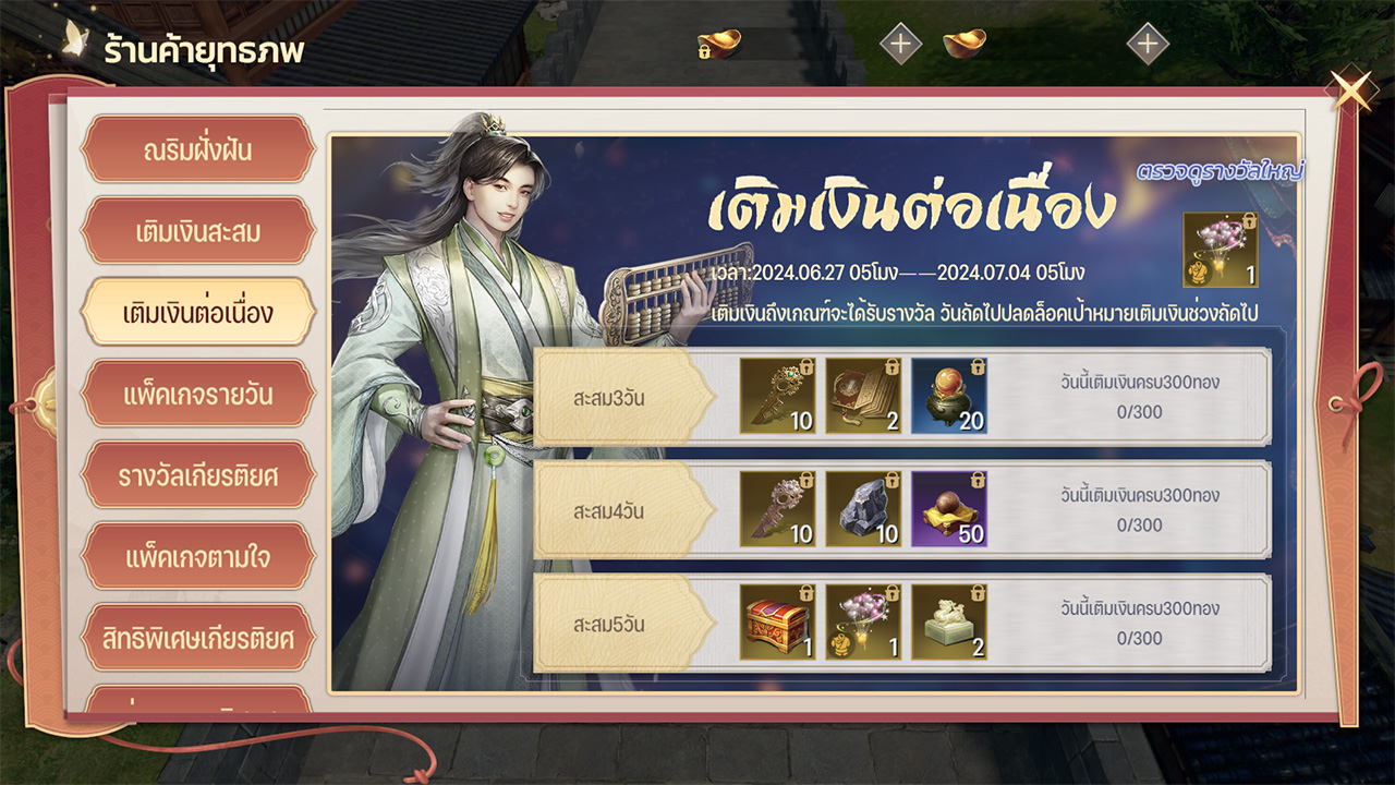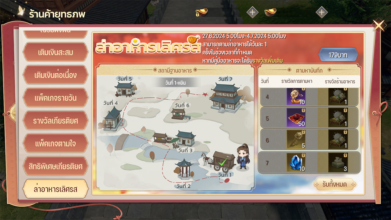 กิจกรรมเช็คอินเข้าเล่นเกมทุกวัน 7 วัน ได้รับไอเทมหลากหลายไม่ซ้ำ และเมื่อซื้อเพิ่ม 179 บาท จะได้รับได้รับไอเทมหลากหลาย ไฮไลท์ไอเทม ชิ้นส่วนคู่หูแดง 3 ตัว แบบเลือกเอง / ตรามังกรวารี / น้ำค้างภูเขาสวรรค์