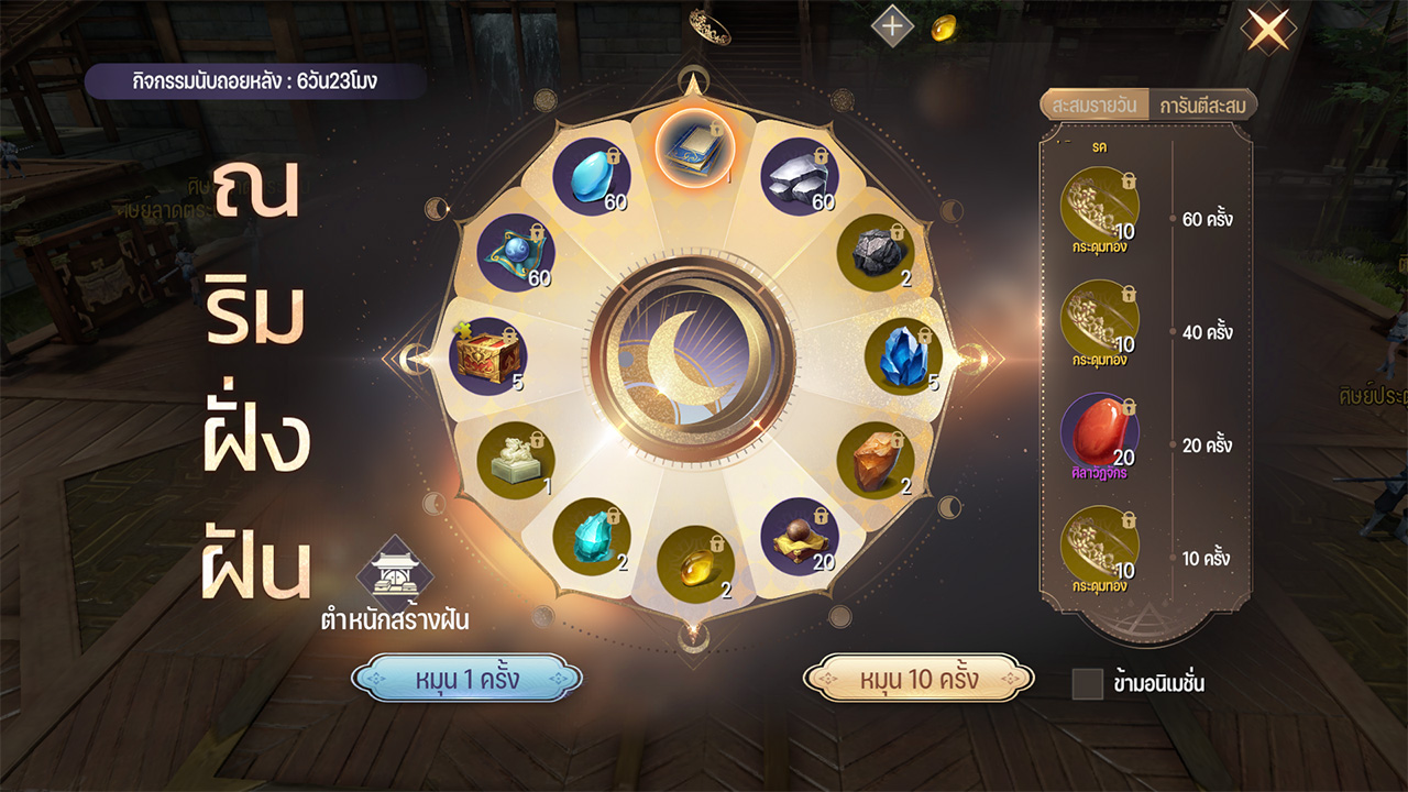 กิจกรรมหมุนกงล้อรอบใหม่ ไฮไลท์ไอเทม "เศษหน้ามนตราสงัด" และไอเทมการันตีอื่น ๆ มากมาย เช่น เศษทรายทอง, ชิ้นส่วนคู่หูแดง 3 ตัว แบบเลือกเอง #3 (สามารถเลือกชิ้นส่วน ผู้กล้าฮ่องเต้ / ยอดยุทธฟ่านเสียน / อ๋องสือซานหลาง)