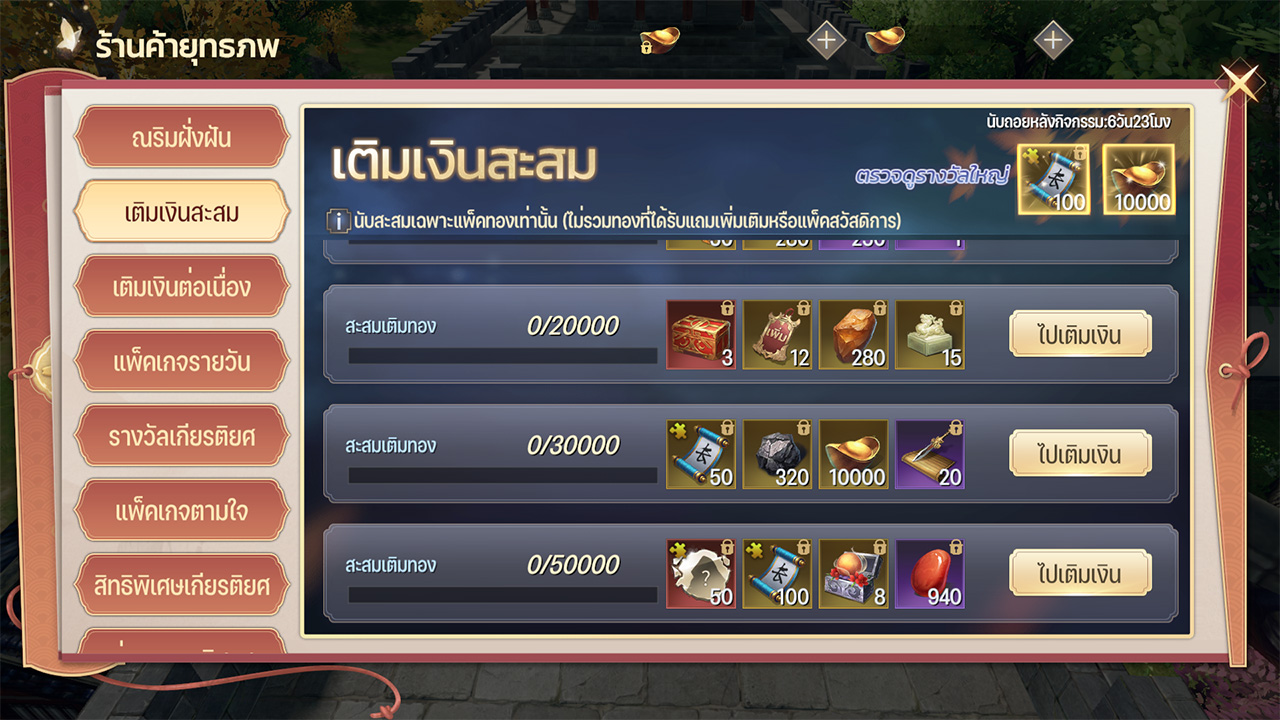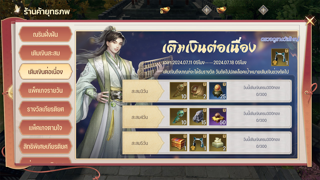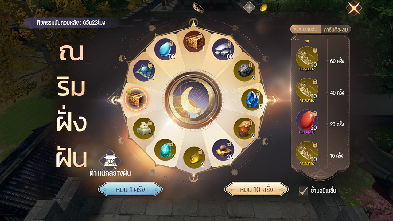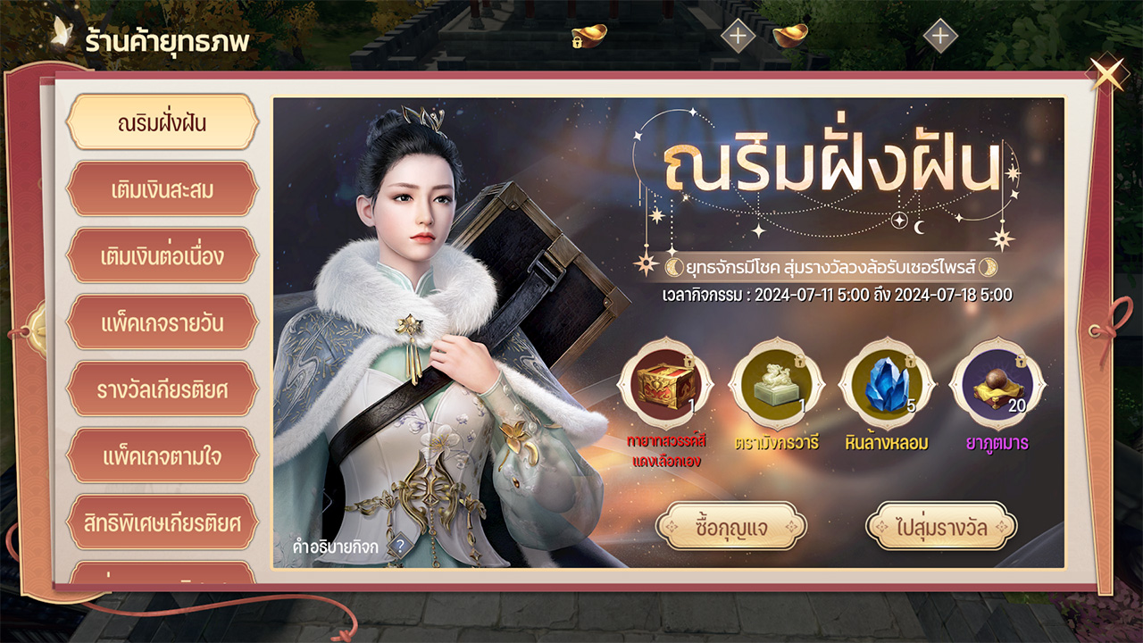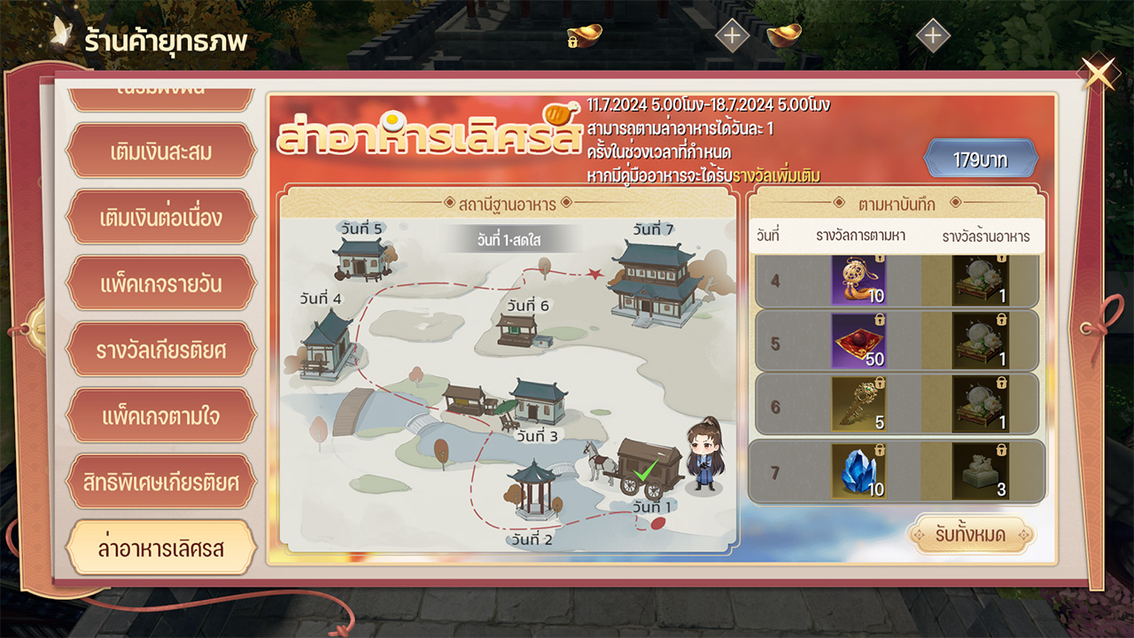 กิจกรรมเช็คอินเข้าเล่นเกมทุกวัน 7 วัน ได้รับไอเทมหลากหลายไม่ซ้ำ และเมื่อซื้อเพิ่ม 179 บาท จะได้รับได้รับไอเทมหลากหลาย ไฮไลท์ไอเทม ชิ้นส่วนคู่หูแดง 3 ตัว แบบเลือกเอง / ตรามังกรวารี / น้ำค้างภูเขาสวรรค์