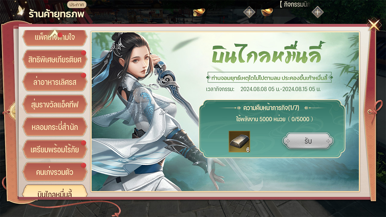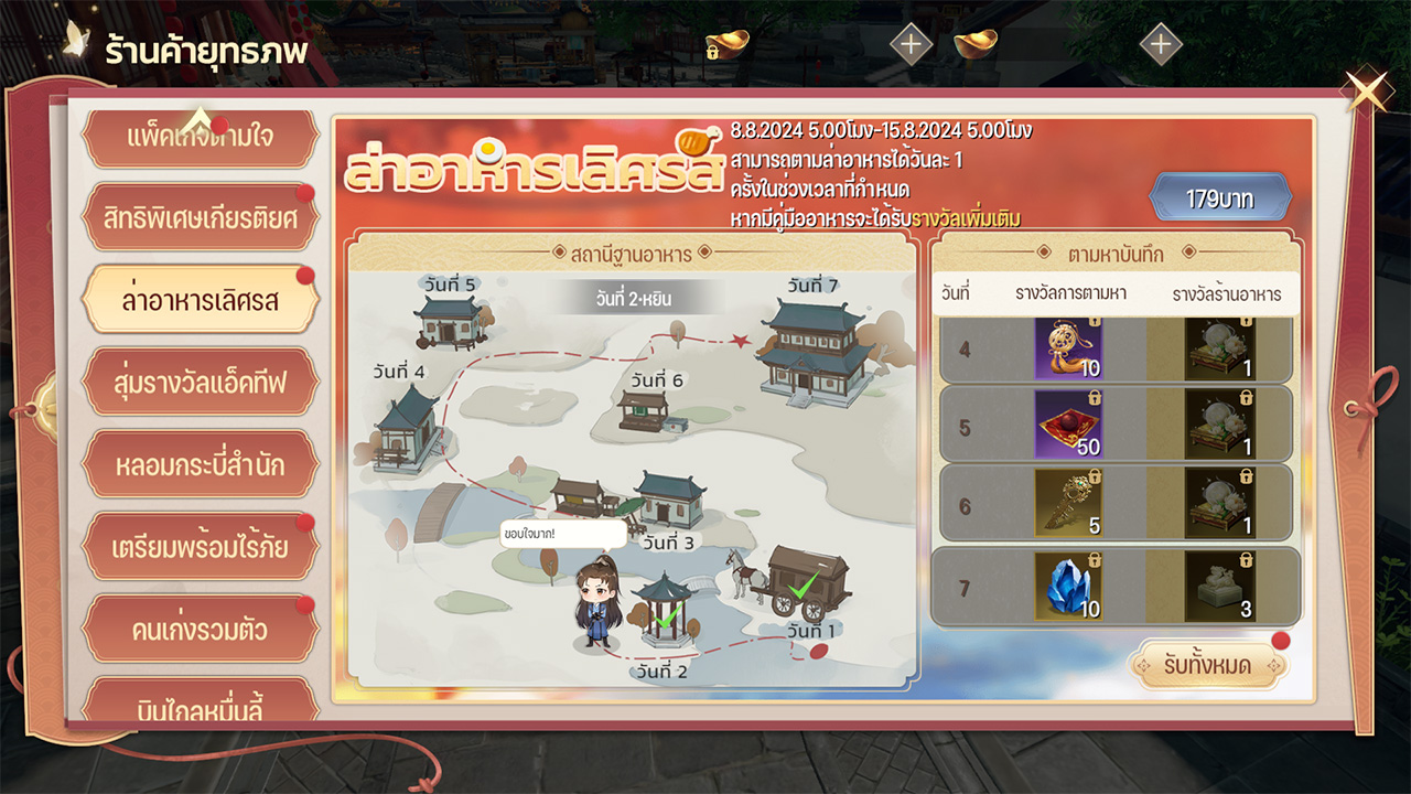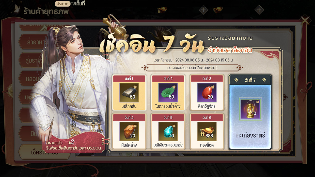กิจกรรมเช็คอินเข้าเล่นเกมทุกวัน 7 วัน ได้รับไอเทมหลากหลายไม่ซ้ำ และเมื่อซื้อเพิ่ม 179 บาท จะได้รับได้รับไอเทมหลากหลาย ไฮไลท์ไอเทม ชิ้นส่วนคู่หูแดง 3 ตัว แบบเลือกเอง / ตรามังกรวารี / น้ำค้างภูเขาสวรรค์
