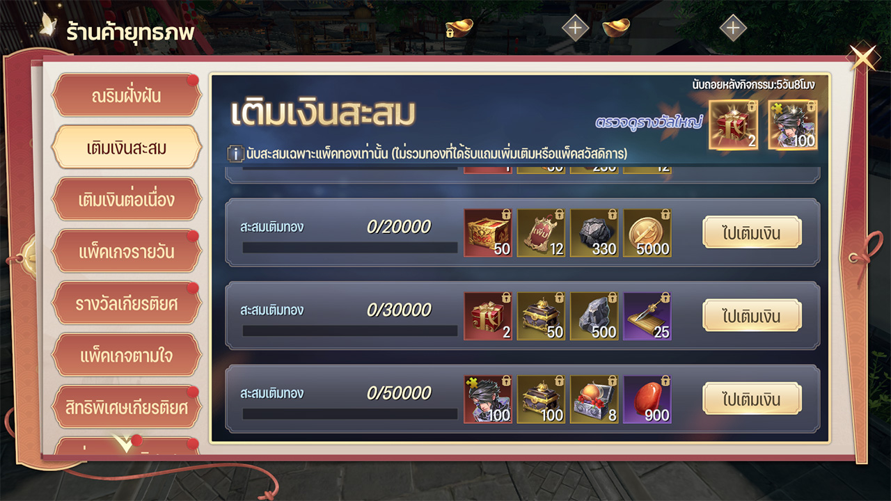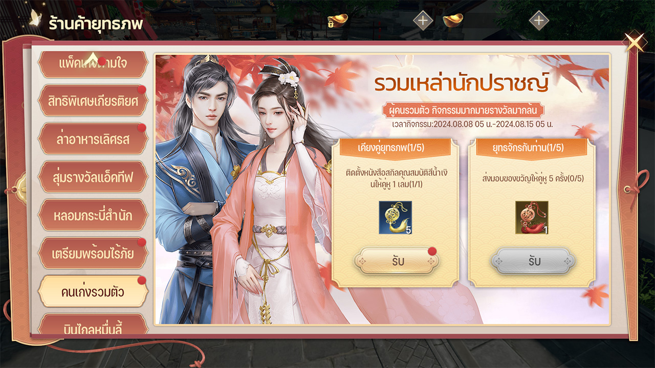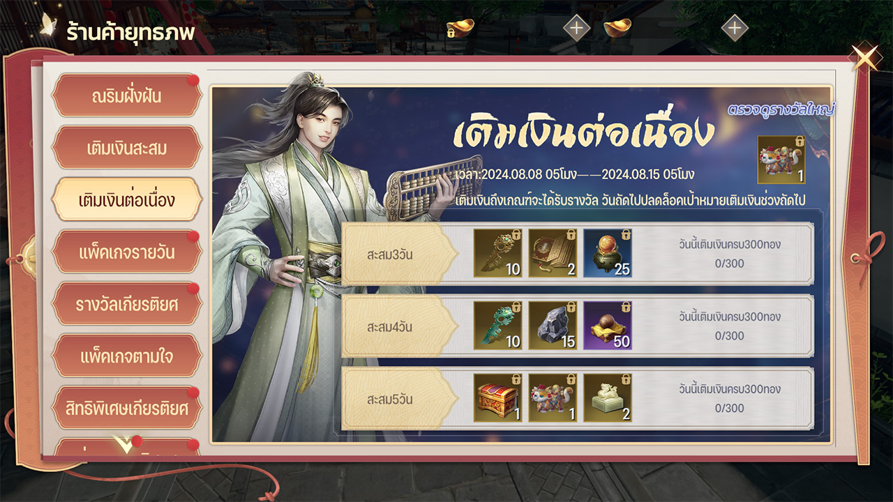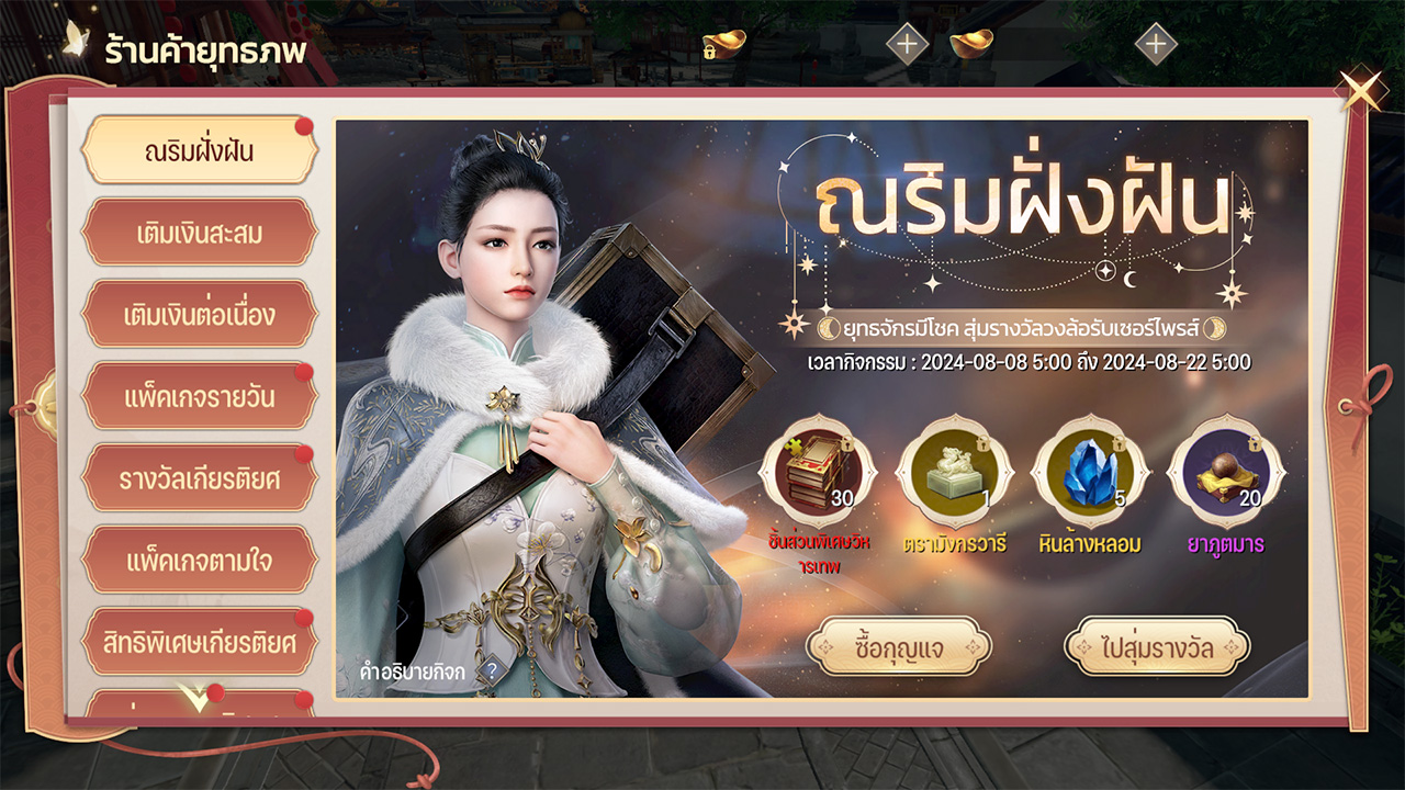 กิจกรรมเช็คอินเข้าเล่นเกมทุกวัน 7 วัน ได้รับไอเทมหลากหลายไม่ซ้ำ และเมื่อซื้อเพิ่ม 179 บาท จะได้รับได้รับไอเทมหลากหลาย ไฮไลท์ไอเทม ชิ้นส่วนคู่หูแดง 3 ตัว แบบเลือกเอง / ตรามังกรวารี / น้ำค้างภูเขาสวรรค์