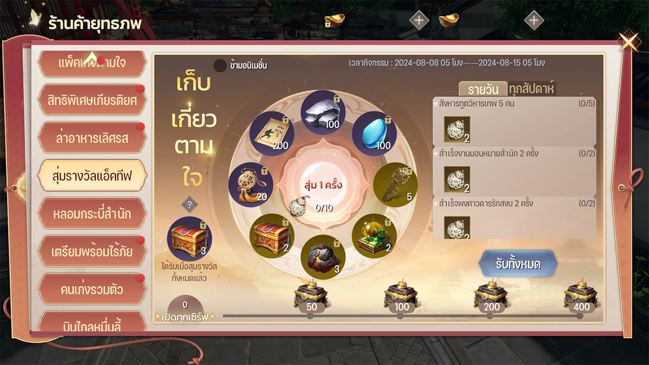 - หมุนสะสมครบ 200 ครั้ง / วัน ได้รับ ชิ้นส่วนคู่หูแบบเลือกเอง #3 (เลือกชิ้นส่วน ผู้กล้าฮ่องเต้ / ยอดยุทธฟ่านเสียน / อ๋องสือซานหลาง)