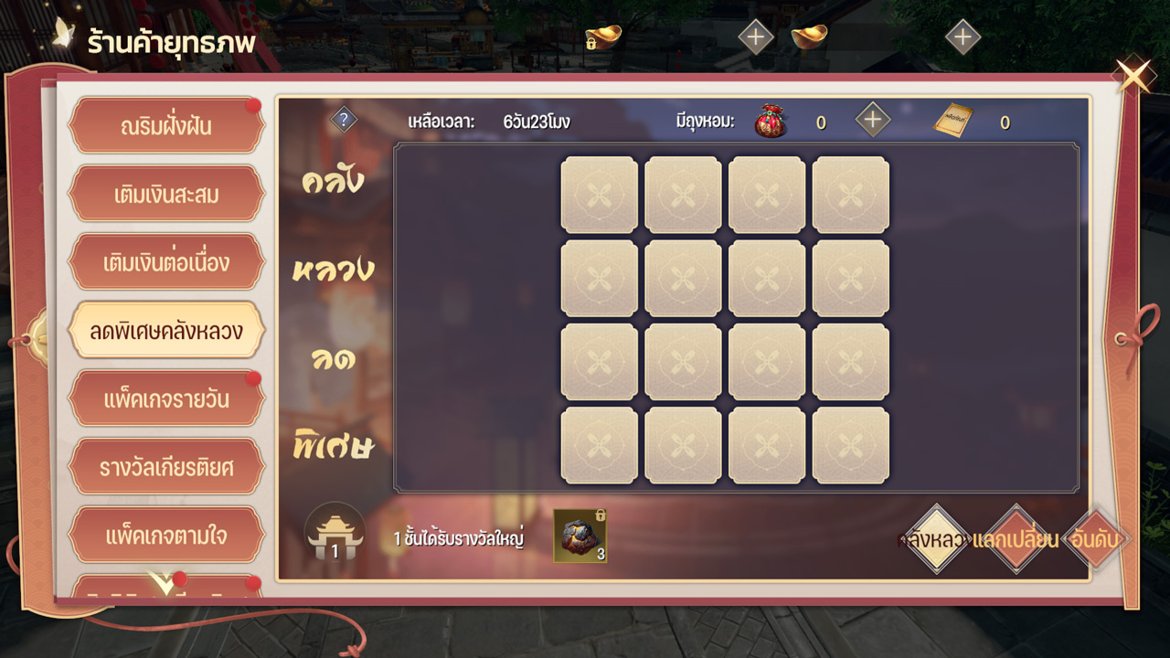 ผู้เล่นสามารถกดรับถุงหอมได้ฟรี 3 ชิ้น หรือซื้อถุงหอมได้จากเมนูแลกเปลี่ยน เพื่อมาเปิดป้ายลุ้นรางวัลเป็นไอเทมสำหรับ พัฒนาตัวละคร / ภูต / คู่หู รวมถึงได้แต้มเพื่อแลกไอเทมเพิ่มเติมในเมนูแลกเปลี่ยน ไฮไลท์ไอเทม "รางวัลผ่านขั้น - ชิ้นส่วนคู่หู 3 ชิ้นแบบเลือกเอง" และ "รางวัลให้แลก - ศิลาเทพ"