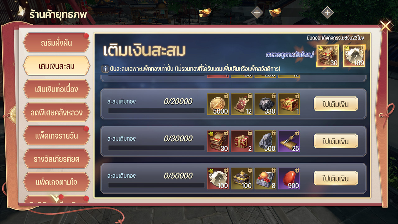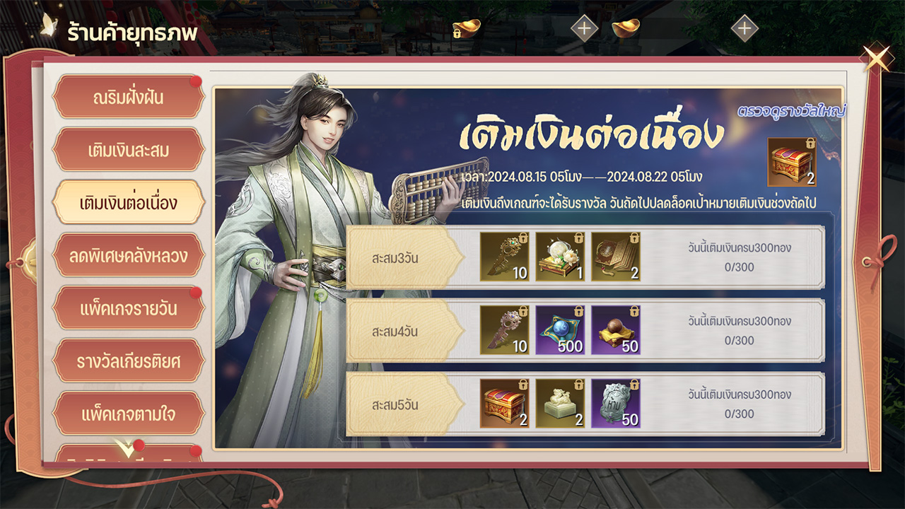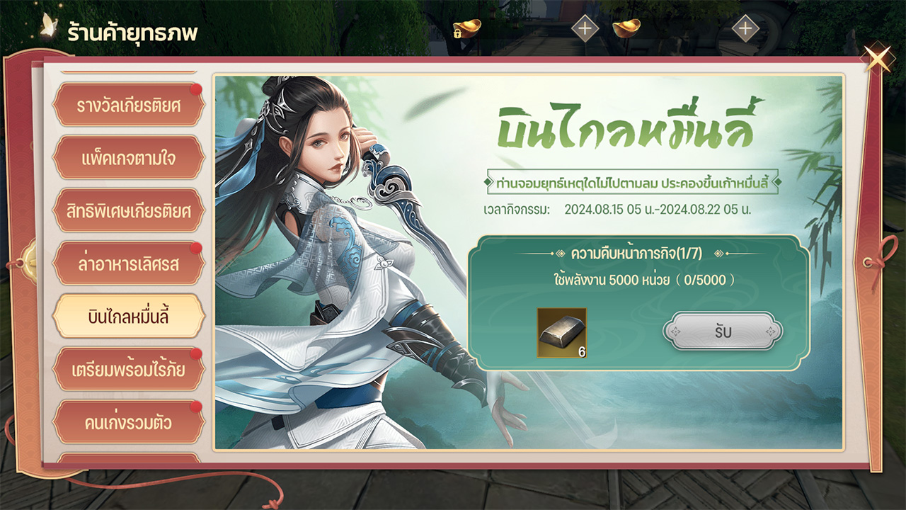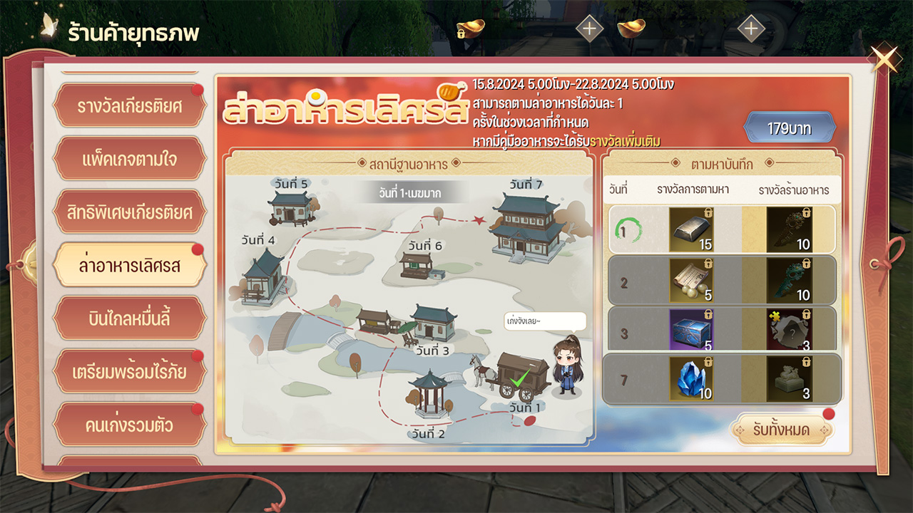 กิจกรรมเช็คอินเข้าเล่นเกมทุกวัน 7 วัน ได้รับไอเทมหลากหลายไม่ซ้ำ และเมื่อซื้อเพิ่ม 179 บาท จะได้รับได้รับไอเทมหลากหลาย ไฮไลท์ไอเทม ชิ้นส่วนคู่หูแดง 3 ตัว แบบเลือกเอง / ตรามังกรวารี / น้ำค้างภูเขาสวรรค์
