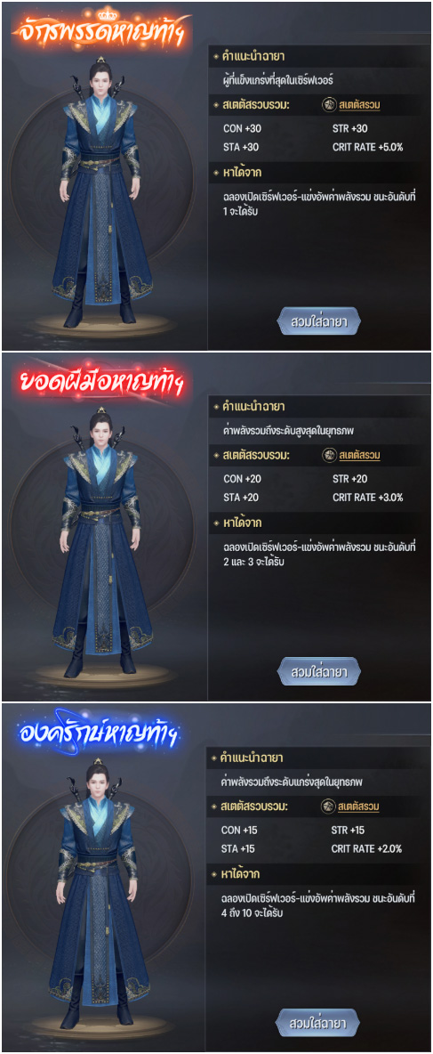 เหล่าจอมยุทธ์หาญท้าฯ จงเตรียมการให้พร้อม ถึงเวลาของ Seasonal Server! เปิดเซิร์ฟเวอร์พิเศษ ที่มาพร้อมการแข่งขันชิงอันดับ รับไอเทมใหม่ล่าสุด "ชุดเซตเก้าสวรรค์" ที่ไม่เคยมีมาก่อน เฉพาะเซิร์ฟเวอร์ Seasonal เท่านั้น เริ่ม 25 พ.ย. - 25 ธ.ค. 67